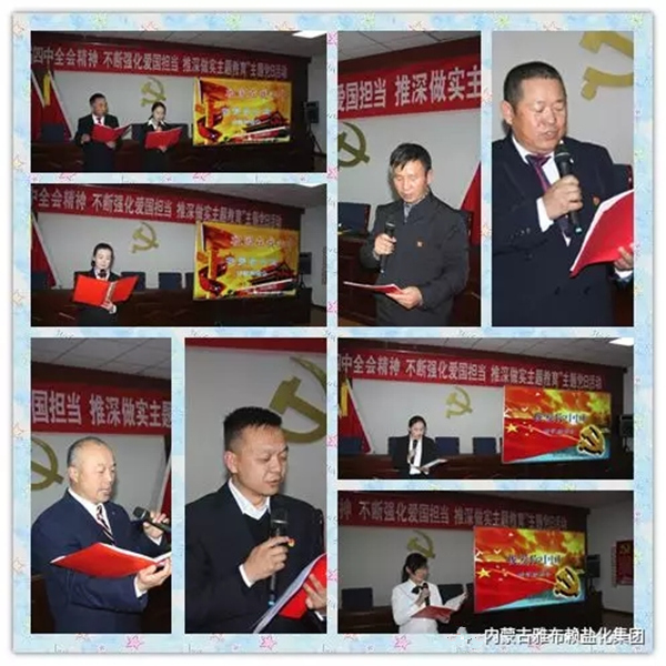 为认真学习宣传贯彻党的十九届四中全会精神,同时扎实落实《新时代爱国主义教育实施纲要》和旗委《关于在“不忘初心、牢记使命”主题教育中加强爱国主义教育,弘扬爱国主义精神的通知》,切实激发集团公司广大党员干部和职工群众的爱国热情,凝聚奋进新时代和推动企业高质量发展的磅礴力量,有力推动集团公司“不忘初心,牢记使命”主题教育走深走实,1125日晚,雅盐化集团公司7个党支部联合开展“学深悟透十九届四中全会精神不断强化爱国担当 推深做实主题教育”主题党日活动。